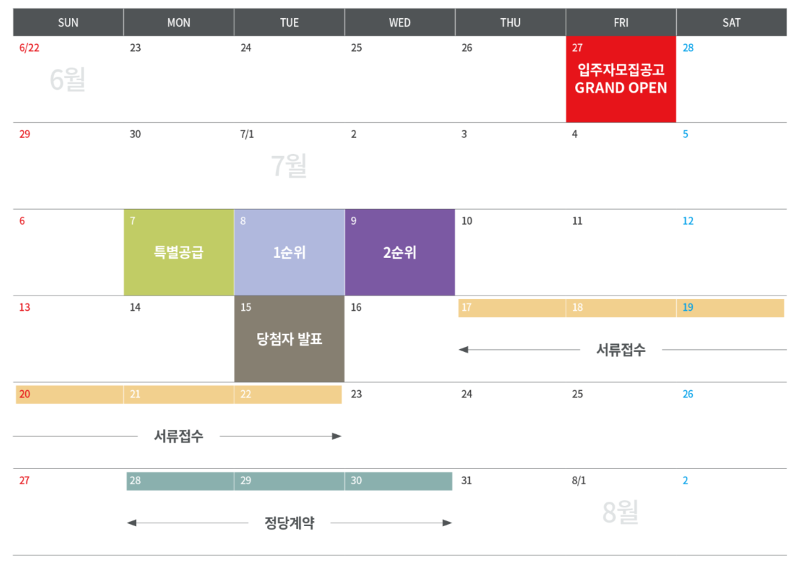특별공급은 7월 7일(월), 일반청약은 7월 8일(화)이며, 당첨자 발표는 7월 15일(화)에 이루어질 예정입니다. 한강 조망권과 교통 접근성 등으로 높은 관심을 받고 있는 곳입니다.